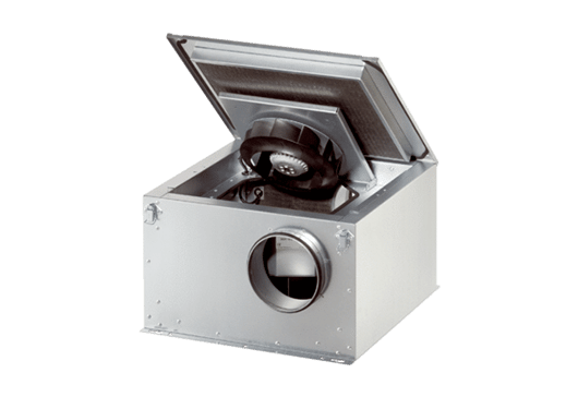 Caisson de ventilation insonorisé avec moteur EC et ventilateur pivotant.